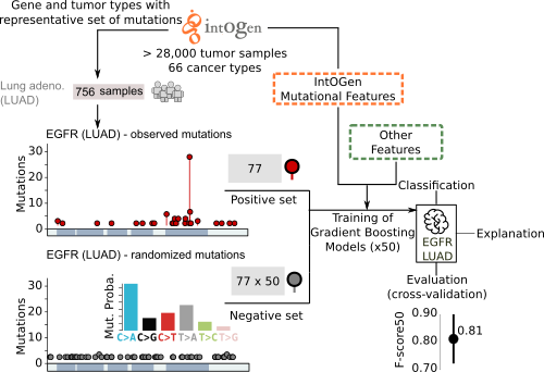 The method is based on the analysis of observed mutations in sequenced tumors and their site-by-site annotation with relevant features. The compendium of cancer genes and the mutational features for each cancer gene across malignancies have been derived from the systematic analysisof tens of thousands of tumor samples (www.intogen.org). Other relevant features have been collected from public databases.