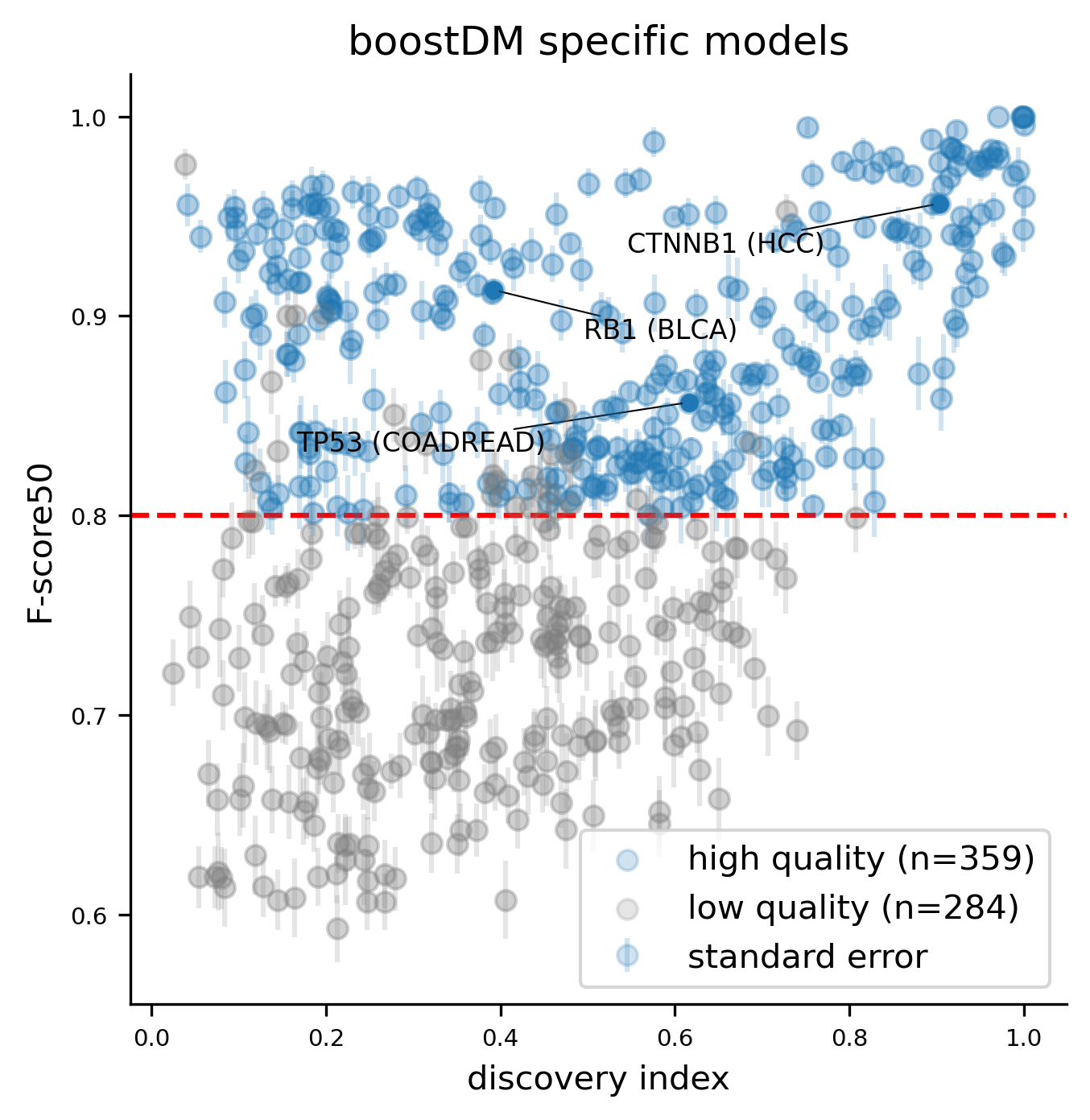 Each model generated by boostDM is realized as the aggregation of a collection of classifiers (base models) trained with random subsets of the training data. In the current version 50 classifiers were trained with random subsets of driver and non-driver mutations. 70% of drivers and non-drivers are selected for training, whereas the remaining 30% are kept for testing (after removing repeated mutations) consistently with a cross-validation approach. Each classifier attained a test performance that we can measure as a weighted F-score that gives more weight to precision than to recall (F-score50). The reported cross-validation performance of each model is given as an average F-score50 across base models.