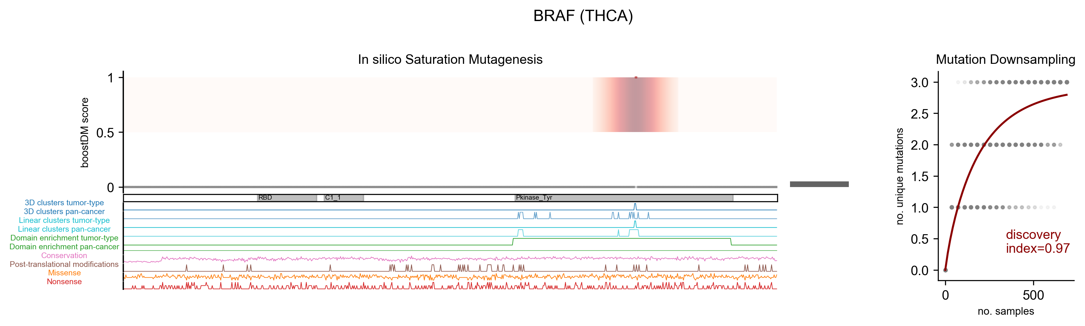 Left: In silico saturation mutagenesis of all coding variants represented in their relative