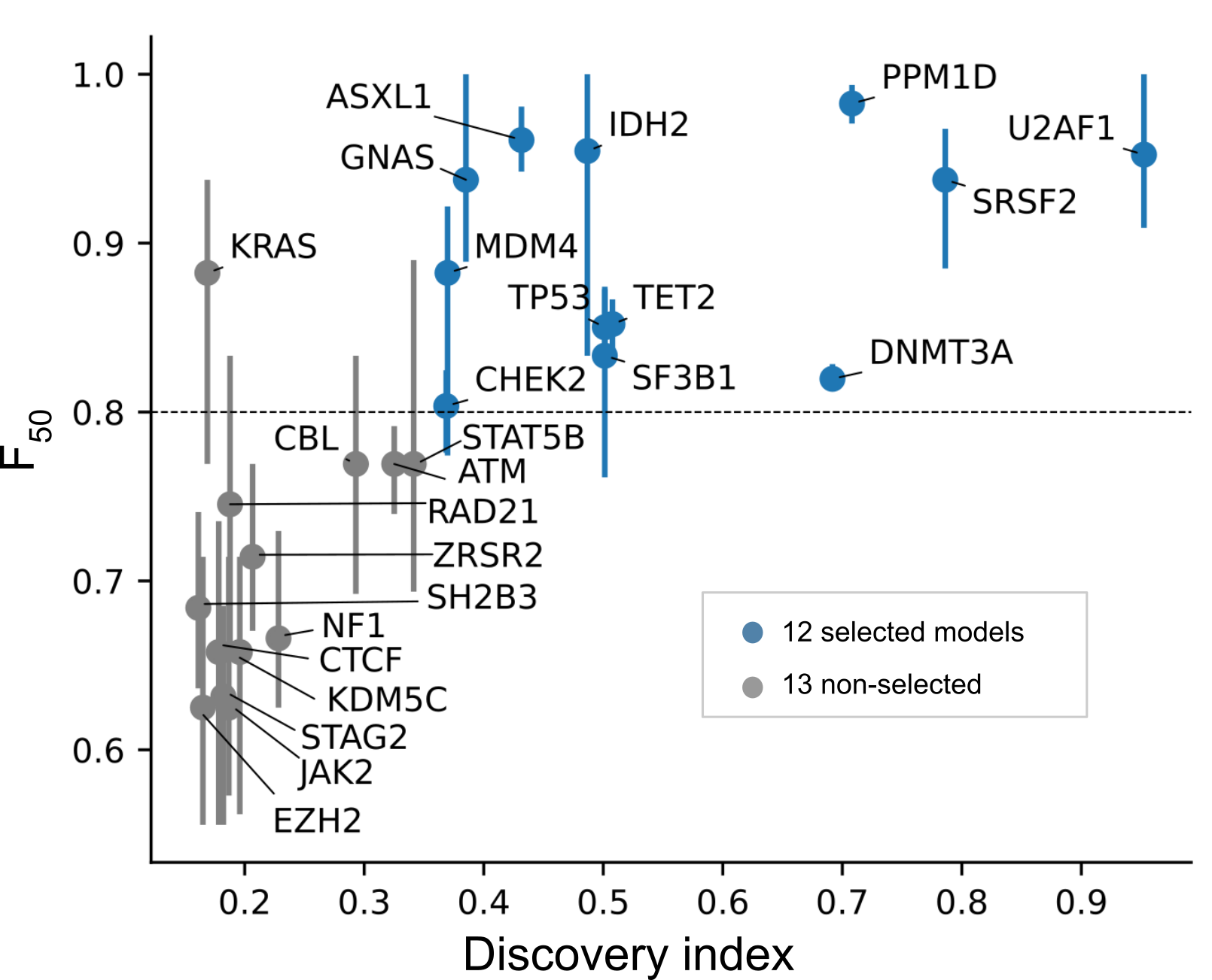 The cross-validation performance of specific models typically increases with the number of mutations employed to train them. We deem good quality models those trained with ≥ 30 mutations, with average cross-validation F-score50 ≥ 0.8 and such that the observed mutations are highly representative (high discovery index, see figure below). As more datasets of sequenced blood-tumor pairs become available, we foresee that the number of reliable models will increase.