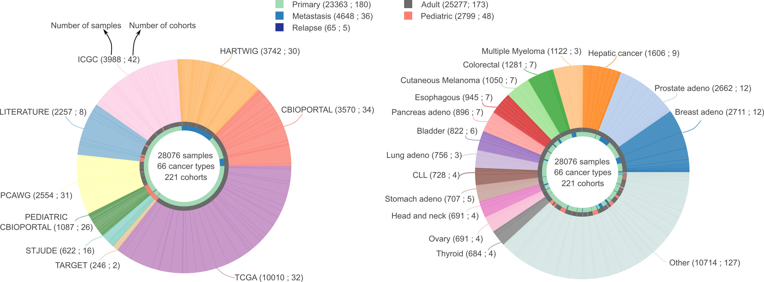 We have manually downloaded and annotated tumor samples from different sources. Specifically, we have used cBioPortal, pediatric cBioPortal, ICGC, TCGA, PCAWG, Hartwig Medical Foundation, TARGET, St. Jude, CPTAC , CGCI and literature gathered sequencing projects projects. For a full list of cohorts included in this release, see the cohorts table in the Downloads tab. For further information about filtering and annotation please check our documentation.